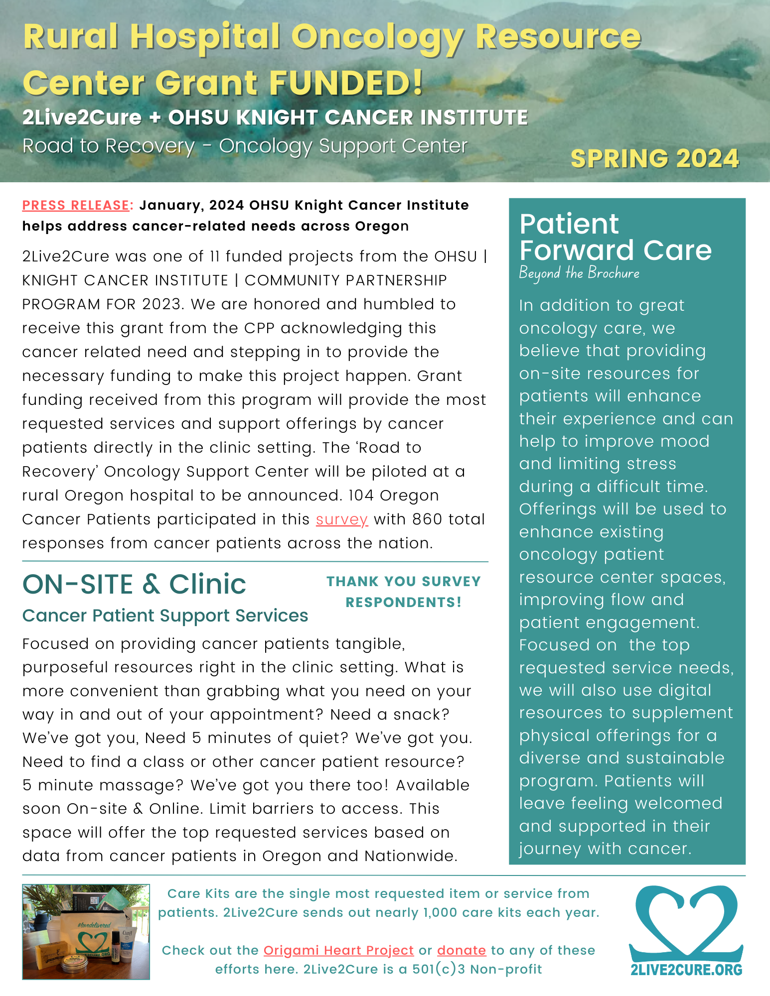 A Road to Recovery Center can help put patients on the right path for physical and mental well being. Designed to be implemented in any hospital setting. Minimal effort and funds can make a MAXIMUM impact on patient experience. We are actively seeking oncology departments to pilot this program. We have been awarded grant funding through OHSU Knight Cancer Institute | Community Partnership Program to fund a center in a rural Oregon hospital. Reach out to our team today to see how 2Live2Cure can help your hospital become THE hospital for receiving cancer care.